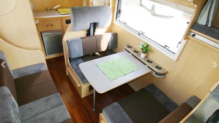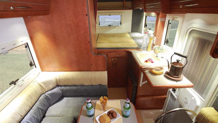 レイアウトは前部に対座ダイネットとロングソファ、後部にギャレーとユーティリティールームを配するリアエントランスの定番レイアウトで、特に目新しいところはない。