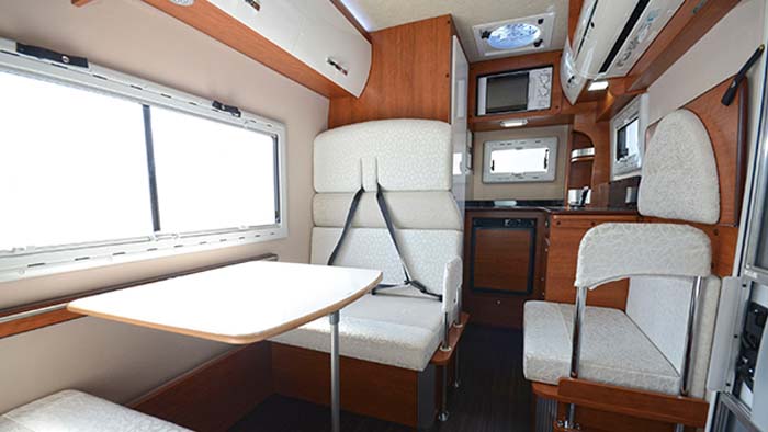 両モデルともFRPシェルを架装するが、ユニークなのはバンク部の前方張り出しの有無を選択できること。ふたり旅なら、バンク部の張り出しがあればバンクベッドが設定できるので、フロアは全てダイネットやギャレーに使える。