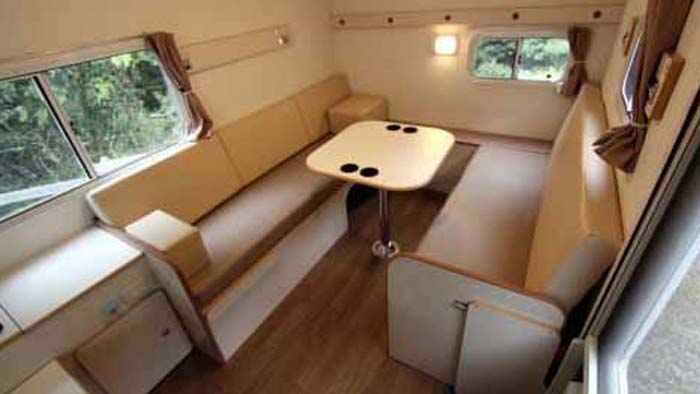 前部にはL字型のギャレーコンソール、後部に二の字型のダイネットを持つ。