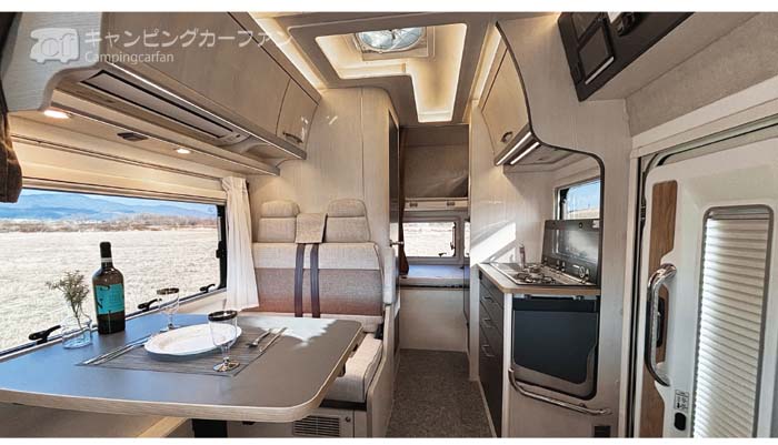 二人で使用するので、ダイネットは前向き乗車にこだわる必要はなく、ラウンジソファタイプでも良い。
