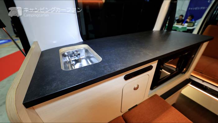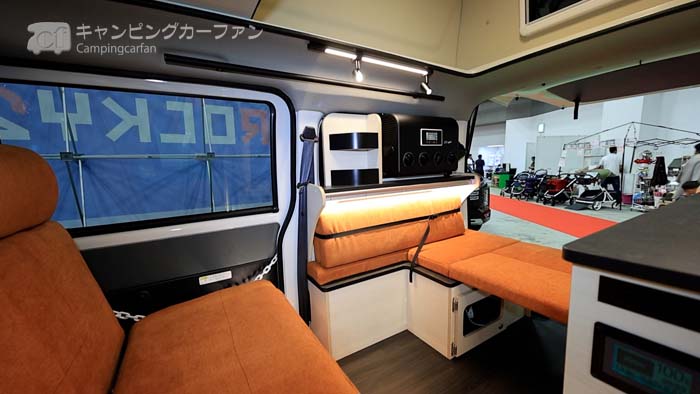 展示車はオレンジ色のシートにアイボリーの家具、キャビネットの天板は濃いグレー、クーラーは黒に塗装されており、全体的に明るいながらも黒のアクセントのインテリアとなっている。