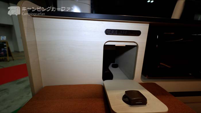 右側後部には車載用クーラーが標準装備される。200Ahのリチウムイオンバッテリーも標準装備されるので、実用的にクーラーが使用できる。更に長時間稼働したい場合は、オプションでリチウムイオンバッテリーを追加できる。