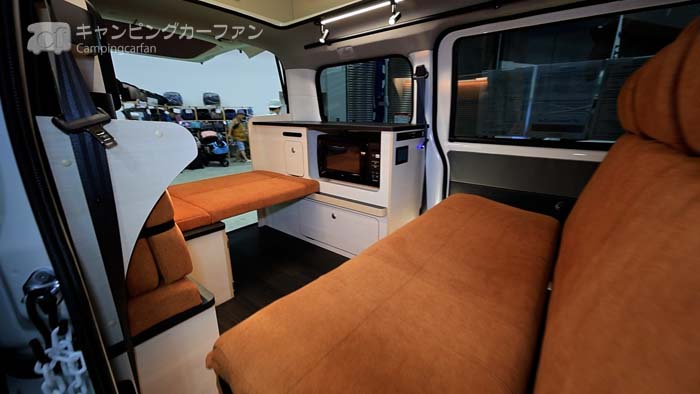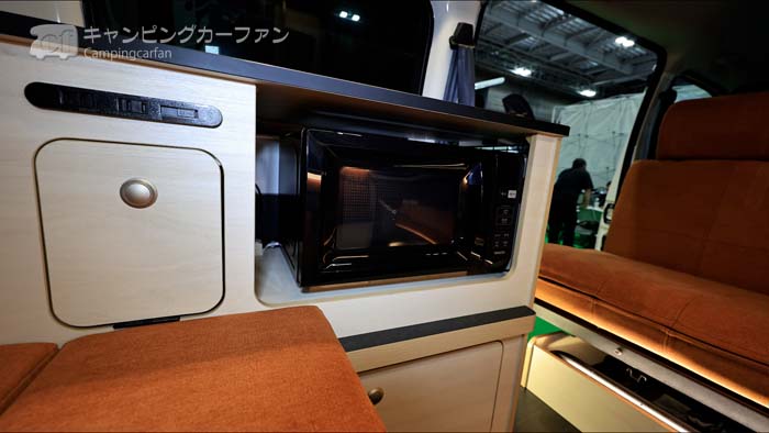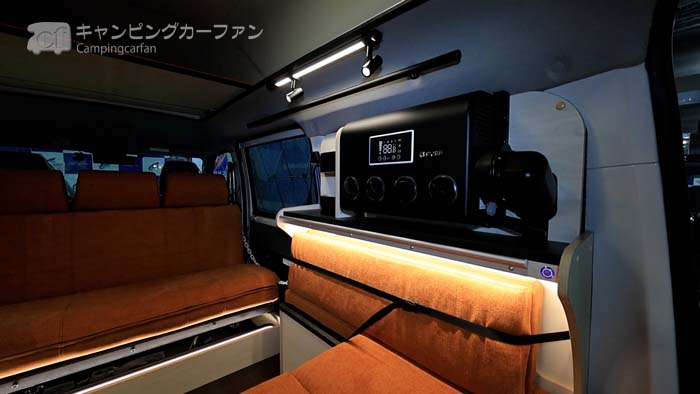 車載用セパレートクーラーと200Ahのリチウムイオンバッテリーを標準装備。電子レンジも標準装備される。FFヒーターやポータブル冷蔵庫、200Wソーラーシステムなどもオプションで設置でき、フル装備でのクルマ旅にも適している。