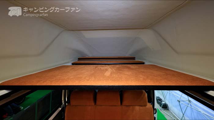 ルーフベッドは1835x1000mmの大きさ。1000mmの幅は、家庭用ではシングルベッドの幅に相当するが、キャンピングカー要件では1名あたり500mmあれば良いので、2名が就寝できる。ただしここは子供2名用とされている。