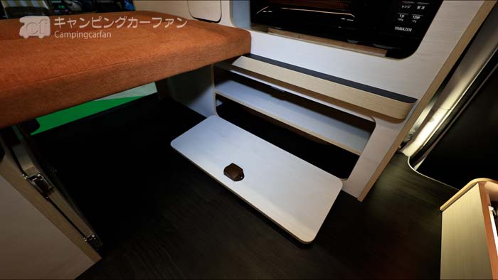 冷蔵庫はポータブル冷蔵庫がオプションで用意されているが、決まった設置スペースは用意されていないので、ベッドの下に置くことになる。電子レンジは家庭用の100V仕様のものが標準装備される。