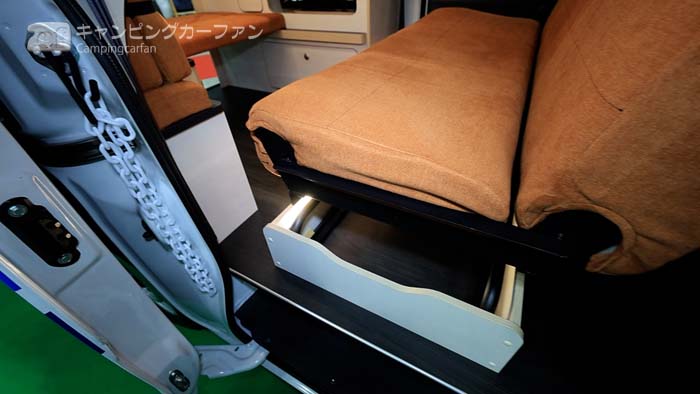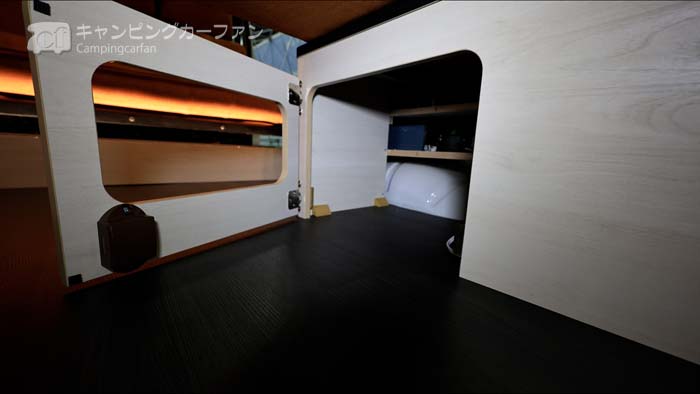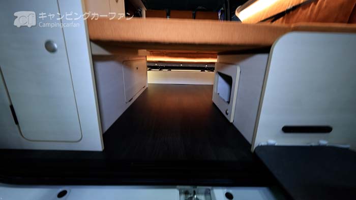 後部ベッド下は大きな収納スペースになる。就寝時はここに荷物を収納すると、ベッドが広く使用できる。