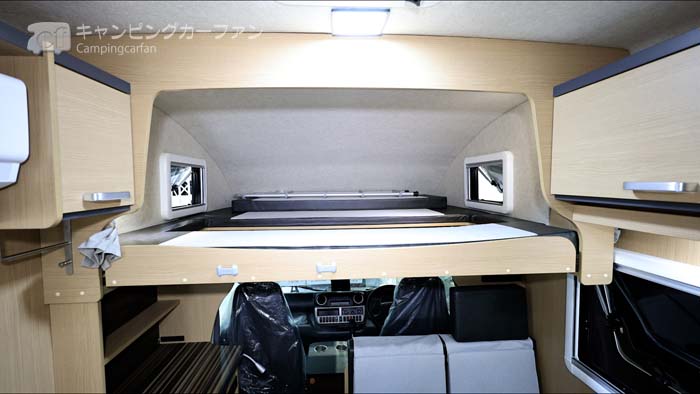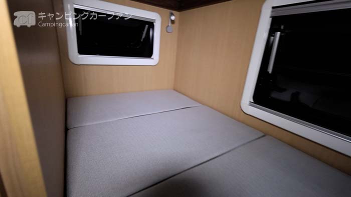 バンクベッドは引き出してセットする。ベッドサイズは1870x1870mmで正方形の大きさ。即ち、縦方向でも横方向でも就寝できる。これは傾斜がある駐車場で車中泊する場合、頭の方向を選択できるので便利だ。