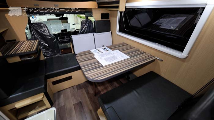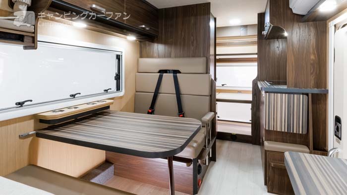 ダイネットには4名が対座できる。エントランスステップ部分に補助マットをはめ込むと、更に多くの人数でテーブルを囲むことができる。ゲストを招いての談笑も可能だ。テーブルは大きく、食事もゆったりとることができる。