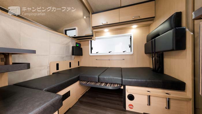 前部に対座ダイネット、中央にギャレーと多目的ルーム、後部に横置き2段ベッドの構成。これはカムロードキャブコンでは最も一般的なレイアウトだ。特に全長が5mを切るという制約の中で、対座ダイネットと多目的ルームを共存させるためには、横置き2段ベッドは有用だ。