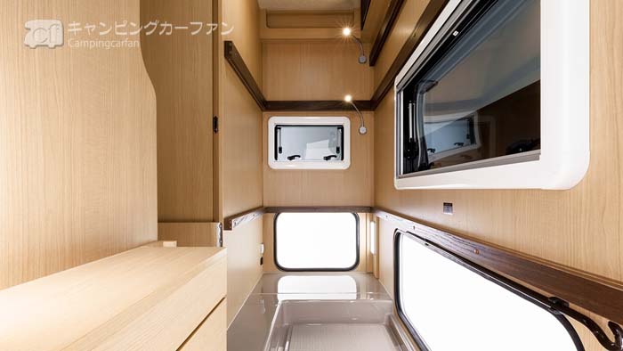 そのような中にあって、コルドバンクスは5mを切るカムロードキャブコンのカテゴリーの頂点に居ながらも、ややレガシーを感じさせるところもある。例えば、シンプルなルーフや照明は、1000万円以上するモデルとしてはやや物足りないだろう。