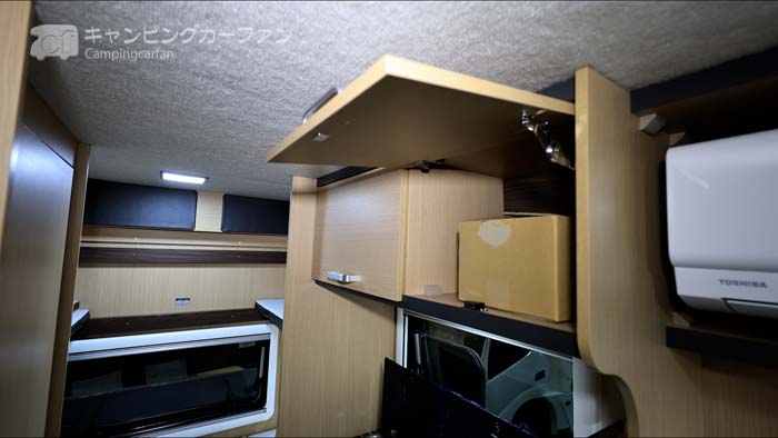 ギャレーキャビネットの上部にもオーバーヘッド収納が設置されている。ここにも食器や調理用具、食材などを収納しておける。