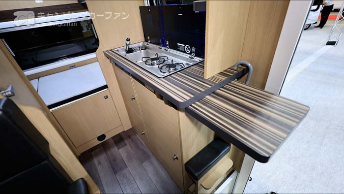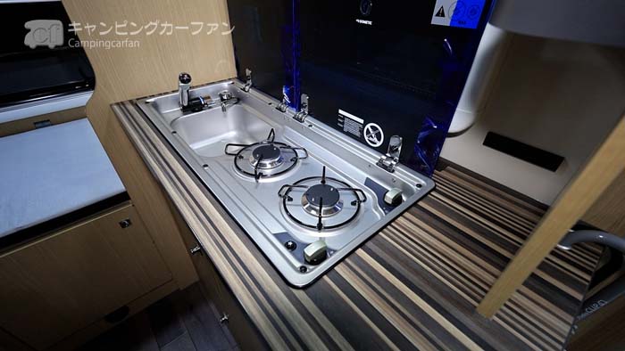 コルドバンクスのギャレーは、他モデルに比べて2ランクほど上だ。まず、常設2口コンロが装備されている。このクラスのキャブコンでは常設コンロを持つモデルは少ない。調理をするユーザーには、大きなアドバンテージだ。