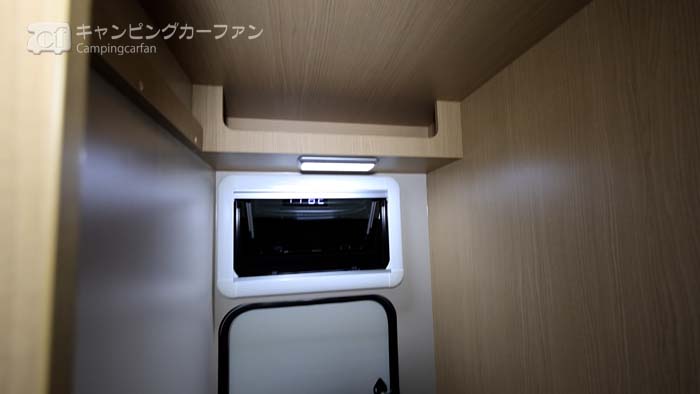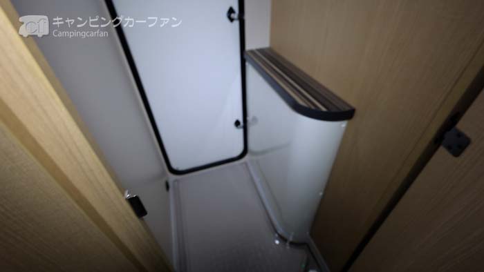 FFヒーターの吹き出し口もあるので、トイレやシャワー時に寒い思いをすることは無い。車外からのアクセス用に大きなドアも設けられており、車外から直接濡れたものなどを積み込むこともできる。