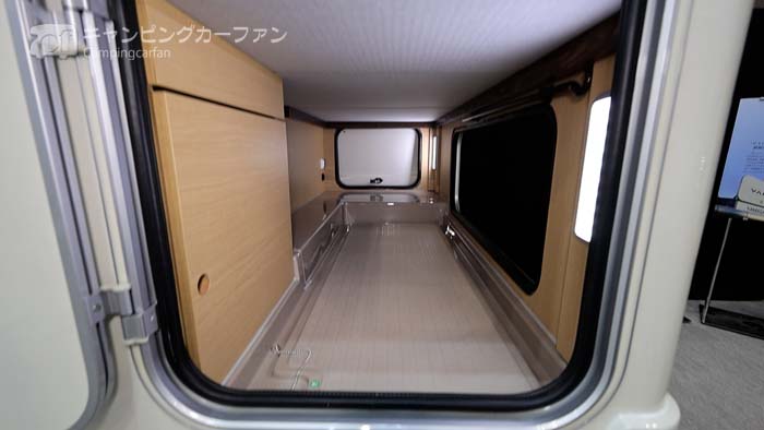 これはコルドバンクスのコンセプトのひとつで、後部は2段ベッドという固定観念にとらわれず、大きな外部収納としても使うという考え方だ。二人で使用する場合などは広いバンクベッドで就寝し、後部は広い収納として使うことができる。
