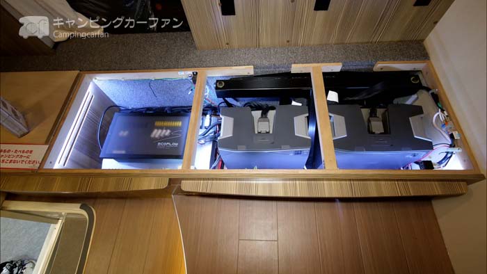 標準では100Ahのディープサイクルバッテリーが3個装備される。その他には、走行充電、外部100V電源入力とチャージャー、1500W正弦波インバーターが標準装備される。