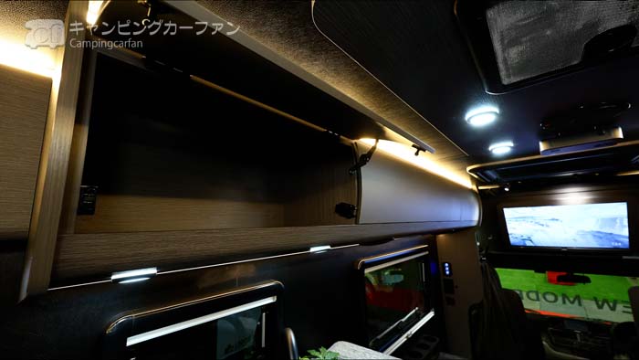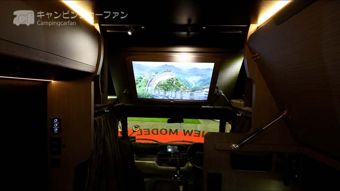 同社のトリップシリーズキャブコンでおなじみの、バンクベッドエンドを持ち上げると32型の大画面テレビが出現する。ナビはナビ本体やドライブレコーダーがセットになったナビオプションを選択すると設置される。