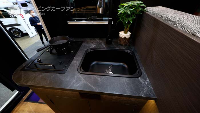 ギャレーはエントランスの横に横向きに設置されている。ギャレーキャビネットの天板にはシンクとフォーセット、それに常設1口コンロが設置されており、大変便利だ。このコンロは折り畳みの足が付いており、取り外して車外などで使用することができる。