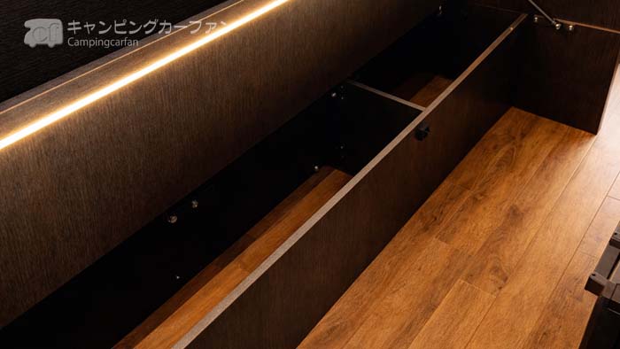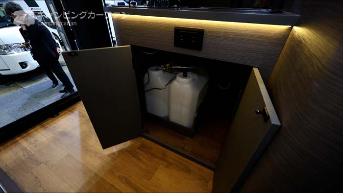 シンクの下には各20Lの給排水タンクが収納されている。車外から直接タンクを出し入れするのは難しいが、エントランスに近いし大きなリアの開口部もあるので、出し入れはそれほど苦労しないだろう。