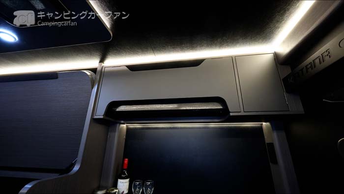 家具やシートの仕上げも高級感があり、オーバーヘッド収納は取っ手を廃したすっきりとしたデザインを採用。軽く押すことで開閉できる。