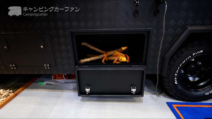 例は今まで見たことが無いが、確かに100Lの大型冷蔵庫を設置するより自由度が高い。コンビニやスーパーが近くにない環境で過ごすことを想定した結果で、多くの食材や冷凍食品を保冷しておける。