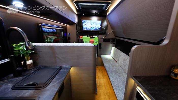 後部にはギャレーとカウンターキャビネットがあり調理も可能。多くのリアエントランスモデルと異なり、多目的ルームはない。乗車定員はダイネットに4名とフロントシートに3名で計7名となっている。