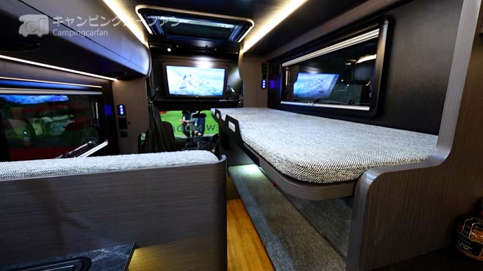 ベッドはダイネットを展開するダイネットベッド、バンクベッド、そして跳ね上げ式のシングル上段ベッドの3か所に用意されている。