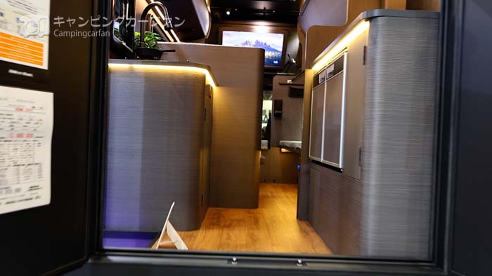 折角のリアエントランスレイアウトなので、右側にも大きな窓が欲しいと思うユーザーもいると思われるが、この跳ね上げ式ベッドはオプションにして、右側の窓がある仕様も選択で切ればさらに良かったかもしれない。