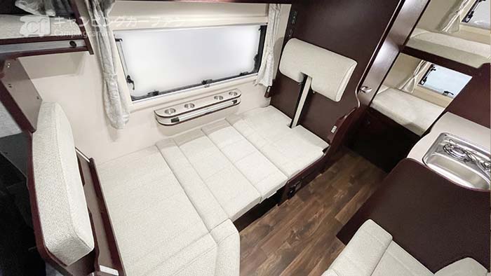 前部にはどちらのレイアウトにも共通で、対座ダイネットとバンクベッドはが配置され、エントランス横にはギャレーキャビネットがある。
