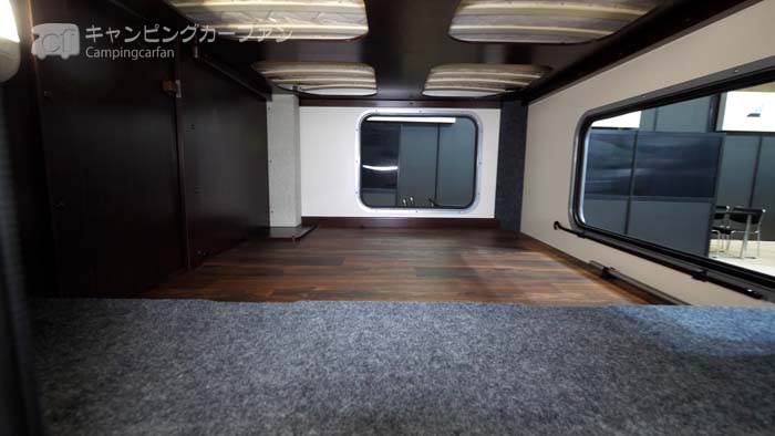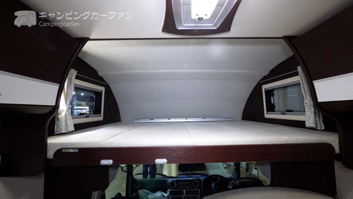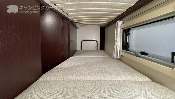 イグアスTypeXの後部ダブルベッドは、1,900×1,400mmの大きさ。1400mmの幅は、家庭用ではレギュラーダブルベッドの幅に相当する。