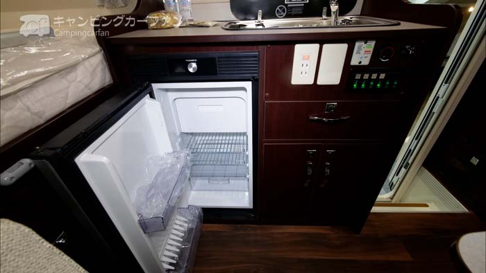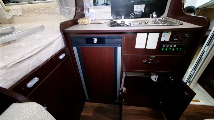 冷蔵庫は70L両開き式が標準装備される。両開き式なので、ダイネット側からでも後部ベッド側からでもアクセスできる。