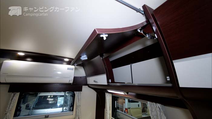 キャブコンなので収納は充実している。まず、ダイネット上部にオーバーヘッド収納が設置されている。TypeXではベッドルームの上部にも両側にオーバーヘッド収納が設置されている。