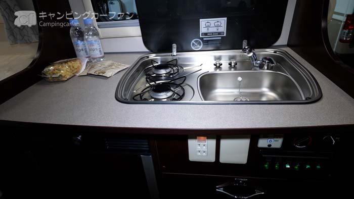 ギャレーキャビネットには2口コンロが一体になったシンクが設置されている。全長5mを切るカムロードキャブコンでは常設コンロを装備するモデルは少ない。多くのモデルでは使用する度にカセットコンロをセットする必要がある。