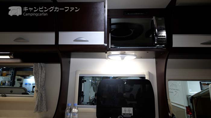 家庭用の100V仕様の電子レンジが標準装備される。ギャレー上部に収納されているので使いやすい。