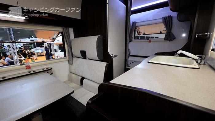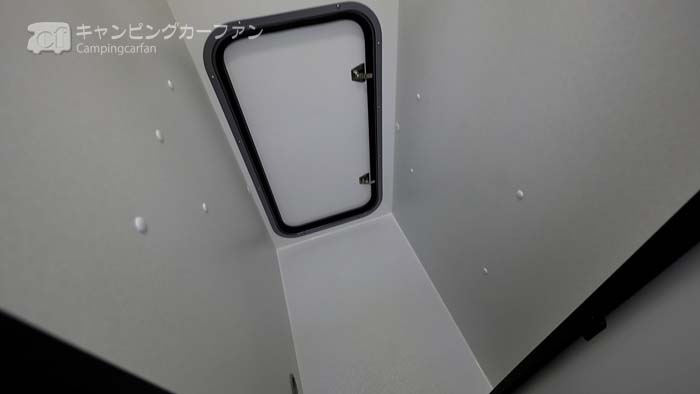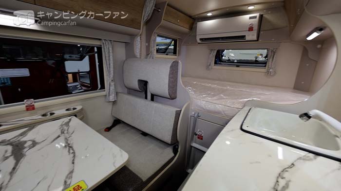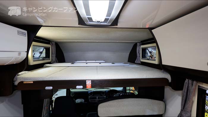 バンクベッドは一般的な引き出し式で、ベッドサイズはTypeWやTypeXと変わらず、車幅方向に就寝するカタチで1806x1790mmの大きさ。家庭用ではキングサイズベッドより広い幅だ。両側にアクリル2重窓が標準装備される。