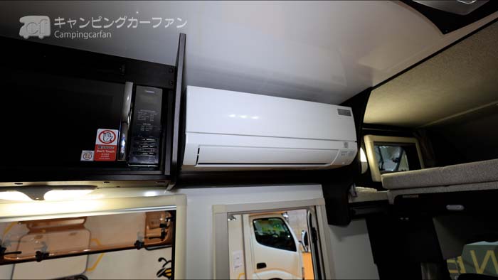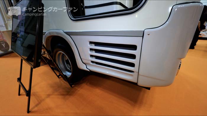 室外機は車体後部左下に設置されている。ベッド下の収納の下なので、収納庫のスペースを侵食しない。