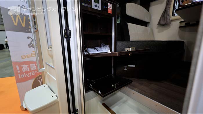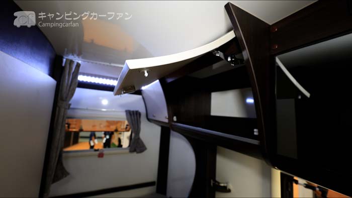 ギャレー上部にもオーバーヘッド収納が設置されており、大きな収納力がある。なお、各19Lの給排水タンクは、後部ベッド下の収納部に設置されており、車外から直接出し入れができる。