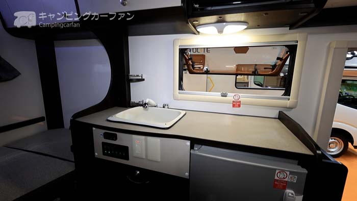 ギャレは天板が広くなり、調理がしやすくなった。冷蔵庫は60L2ドアタイプを標準装備。電子レンジも標準装備される。空調は家庭用エアコンを標準装備。電装系は、300Ahリチウムイオンバッテリーをオプションで装備できる。