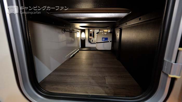 後部のベッド下は大きな収納になっている。ベッドの項でも触れたとおり、ベッドボードを上段にすると、更に収納の高さが稼げる。バゲッジドアは両側に設置されているが、右側のドアは開口部が縦長で、ベッドボードを全て取り外すと自転車等の背の高い積載物も積み込めるだろう。