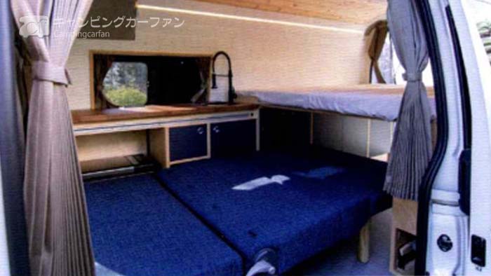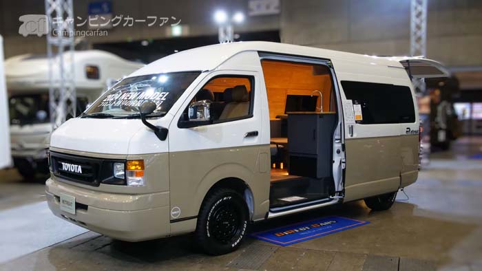 ハイエーススーパーロングをベース車にしたバンコンキャンピングカー。バンライフをテーマにしたモデルで、美しいリアルウッドのインテリアと広く寝心地の良いベッドが魅力。