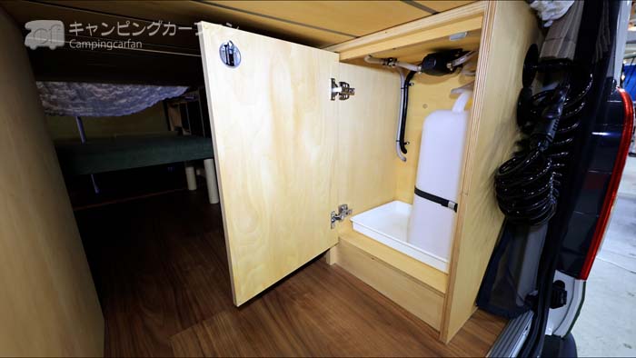 シンクの下には排水タンクが収納されているが、19Lの給水タンクは後部右側に収納されている。