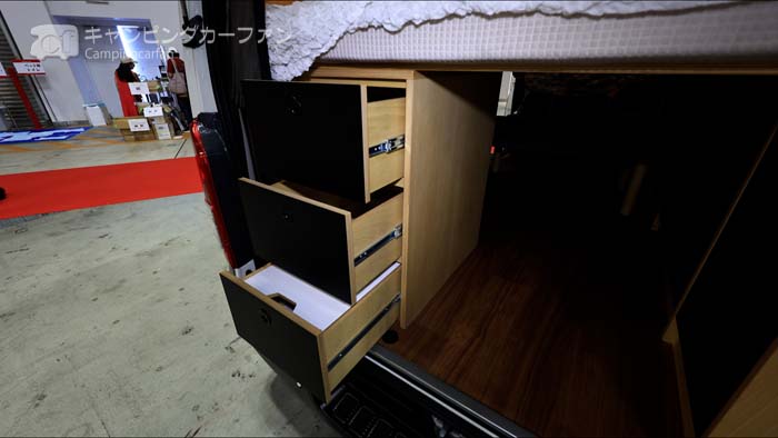 収納はギャレーキャビネットに少しあるが、大きな収納は後部ベッド下にまとめられている。ベッド下後部左側には3段の引き出し収納が用意されている。最下段には蓋が付いており、屋外のテーブルとしても使用できるようになっている。