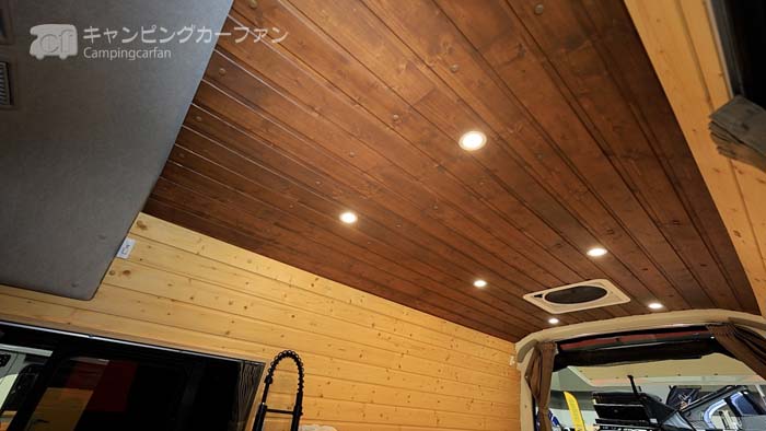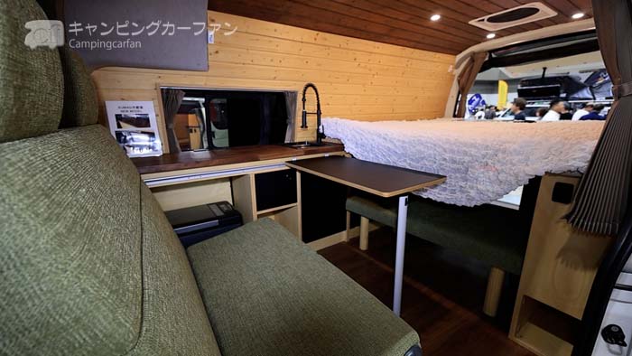 展示車はグリーンのシートとリアルウッドの壁面と天井が美しいインテリアを採用。バンライフをコンセプトと謳うモデルは、自然と相性が良いためか、リアルウッドを使用するケースが多いが、KUMA