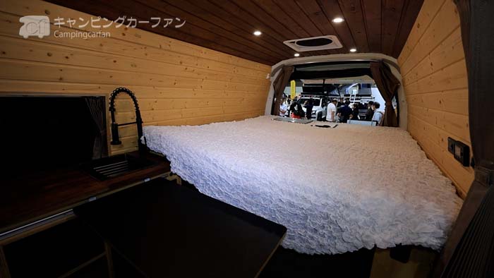 後部の縦置きベッドは、1900x1600mmの大きさ。家庭用では、クィーンサイズのベッドに相当する。キャンピングカー要件では大人3名が就寝できる。また、ベッドマットは比較的厚めで、追加のベッドマットを調達する必要はないだろう。