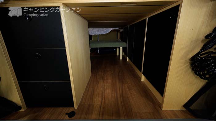 後部ベッド下は大きな収納スペースになるが、ベッドボードを取り外すと自転車等の大きな荷物も積み込むことができる。取り外したベッドボードは、後部左側のキャビネットに収納できる。