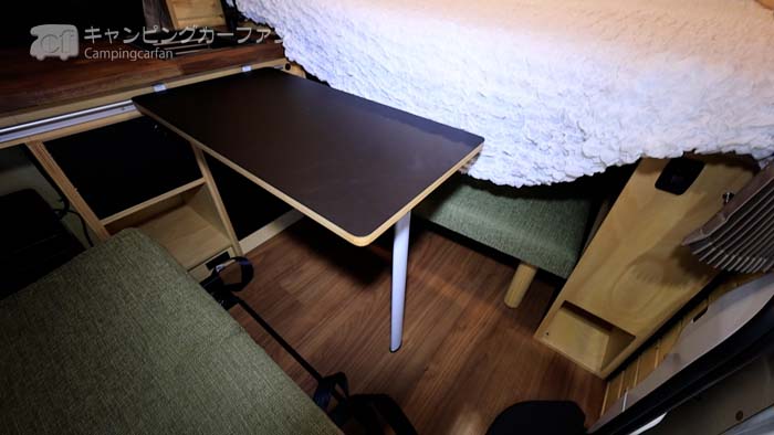 しかし、KUMA Qのアドバンテージは常設の縦置きベッドにある。ダイネットの展開なしにすぐに就寝できる。長身のユーザーは特に実際に横になって確認してみることをお勧めする。