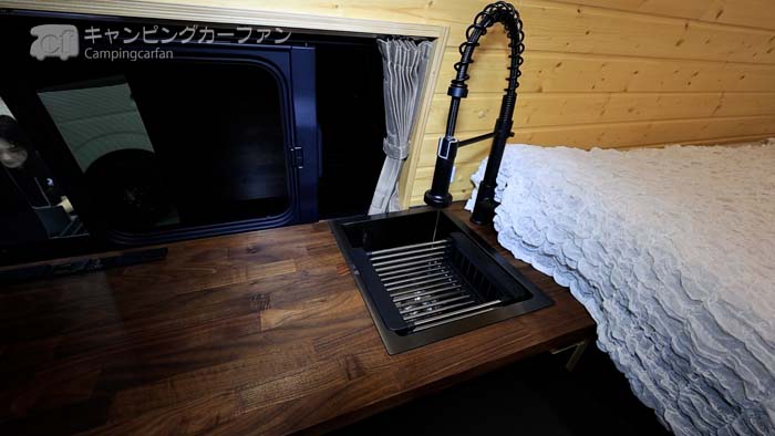ギャレーはダイネットの右サイドに設置されており、広い天板を持つ。天板の後部には深いシンクとお洒落なフォーセットが設置されている。コンロは常設ではないが、ポータブルカセットコンロやIHコンロをセットして調理することができる。