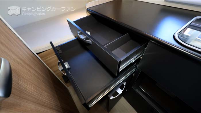 ギャレーキャビネットには引き出し収納が2段と、その下に観音開きの収納が用意されている。