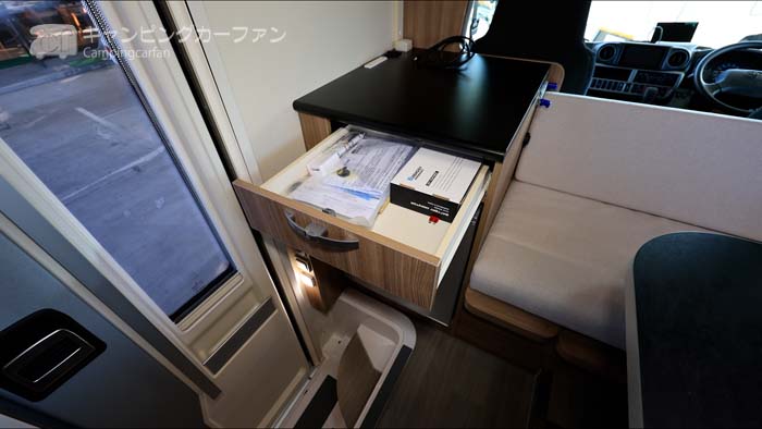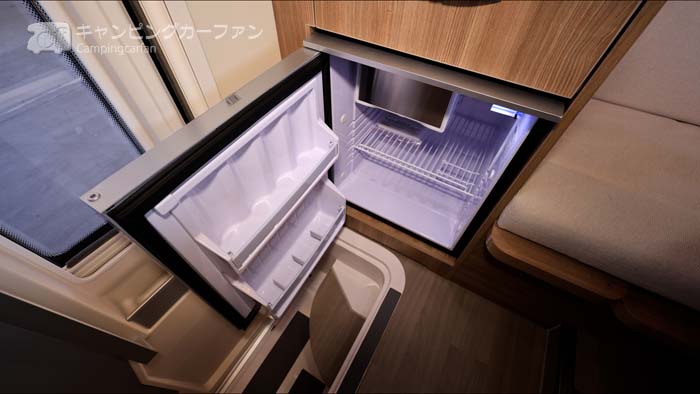 冷蔵庫は65L横開き式が標準装備される。冷凍室もあるので、製氷や冷凍食品の保冷と、飲み物や食品の保冷が同時にできる。両開きなら車外からもアクセスできるのでより便利だったかもしれない。