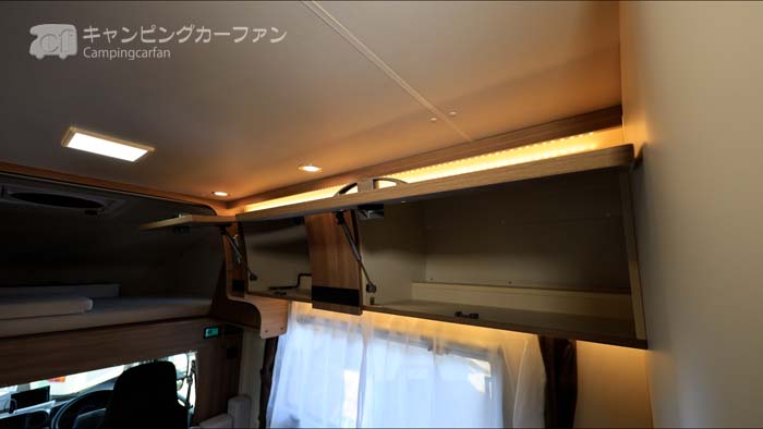 ダイネット上のオーバーヘッド収納は2連の扉で仕切られており、いずれも大きな収納力がある。