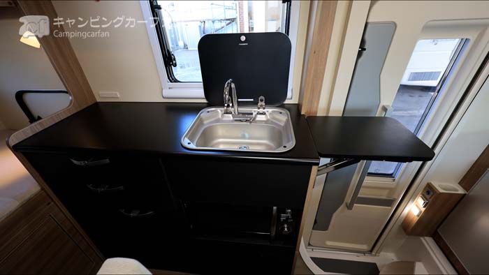 跳ね上げ式の調理台も用意されている。旅先での調理も余裕で行うことができる。